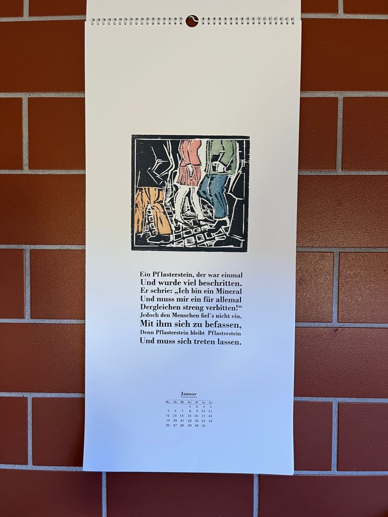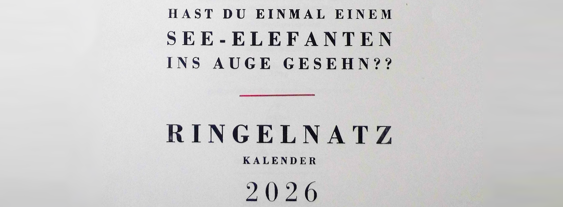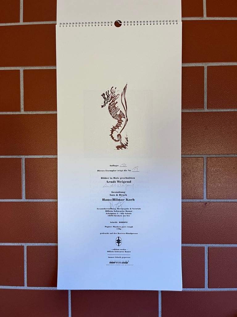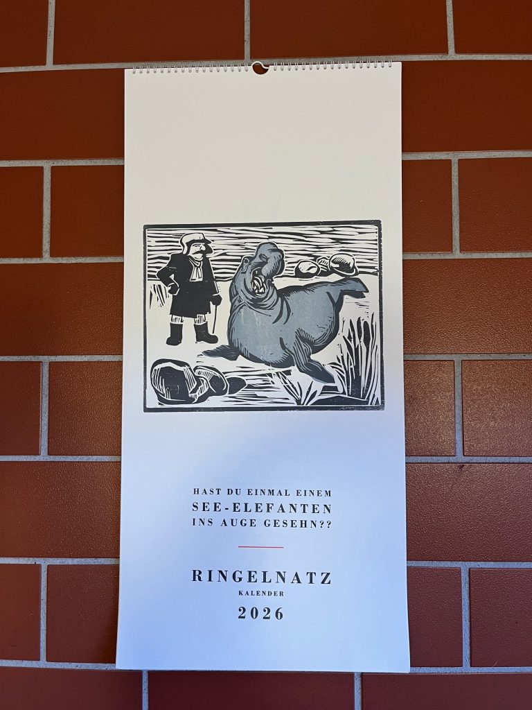 HAST DU EINMAL EINEM SEE-ELEFANTEN INS AUGE GESEHN?? … lautet der Titel des Ringelnatz-Kalenders 2026. Der Bildhauer, Holzschneider und Freund Arndt Weigend liefert die Farbholzschnitte. Hans-Hilmar Koch, der Setzer, Drucker, Pachulke und Prinzipal der Offizin Schwarze Kunst, bringt Grafiken und Texte in Form und aufs Papier. Dafür braucht es um die 14 000 Druckvorgänge – nacheinander erfolgt Blatt für Blatt der Druck von Text, Kalendarium und mehrfarbigen Holzschnitten. Produziert wird der Kalender in der Druckwerkstatt auf einer historischen Druckpresse, der Korrex-Handpresse. (https://offizin-schwarze-kunst.de)