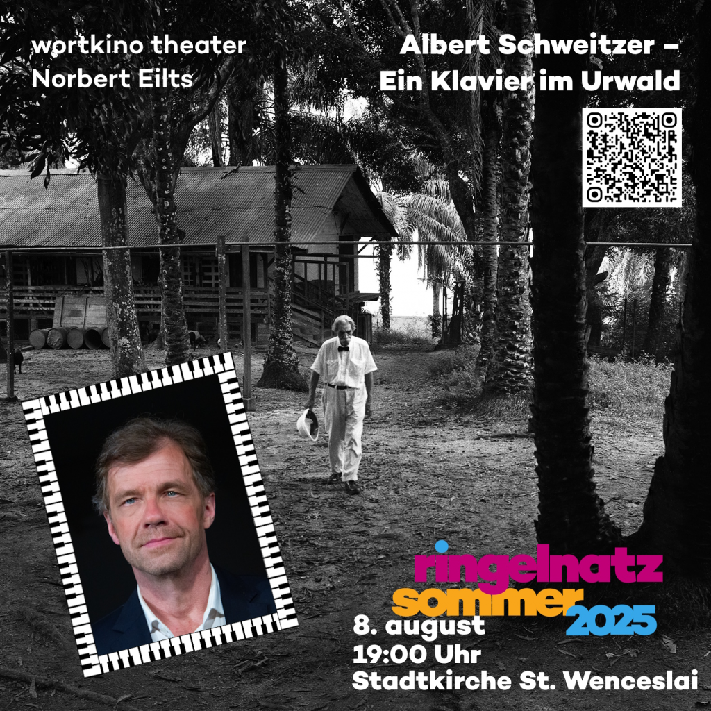 Einen Tag nach Ringelnatz‘ Geburtstag bringt uns das Wortkino-Theater von Norbert Eilts in einem zweistündigen Bühnenprogramm Einblicke in Leben, Werk und Denken des rastlos tätigen Friedensnobelpreisträgers Albert Schweitzer, der in diesem Jahr 150 Jahre alt wäre. Der in Frankreich ebenso wie in Deutschland und Afrika zu Hause war. Und tatsächlich ein extra für ihn gebautes, tropentaugliches Klavier in den Urwald von Gabun bringen ließ. Ein zeitloser Hoffnungsträger war Albert Schweitzer, dessen Aussagen zur Ehrfurcht vor dem Leben im Zeitalter von politischen Krisen, Klimawandel und Künstlicher Intelligenz noch immer aktuell sind.