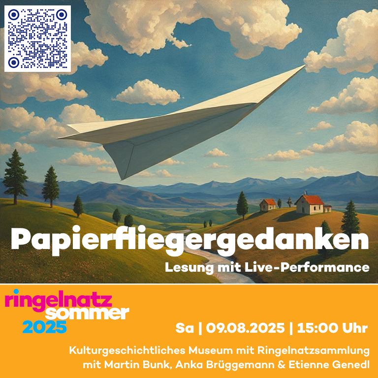 Für den diesjährigen RingelnatzSommer mit dem Schwerpunkt Technologie und Literatur knöpfen sich der Schauspieler Martin Bunk, die Papierkünstlerin Anka Brüggemann und der Leiter des Geburtshauses, Etienne Genedl, Ringelnatz‘ Gedichtband „Flugzeuggedanken“ vor. Begleitet von einer Live-Performance von Anka Brüggemann liest Martin Bunk Gedichte über rasende Raketenautos, mutige Fallschirmspringerinnen und so manche historische Luftturbulenz, die Joachim Ringelnatz geistreich auffängt. Etienne Genedl bietet dazu einen Überblick über die Erfindungen der Luftfahrt, und was das alles mit Joachim Ringelnatz zu tun hat.